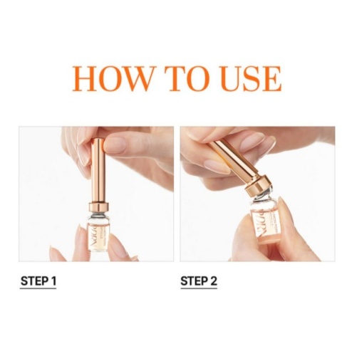 Nałóż złotą nasadkę dołączoną do opakowania na korek i otwórz ampułkę. Następnie delikatnie rozprowadź zawartość na oczyszczoną skórę twarzy, szyi, dekoltu oraz wokół oczu, wmasowując produkt aż do całkowitego wchłonięcia. Pamiętaj, aby zużyć całą ampułkę natychmiast po otwarciu.