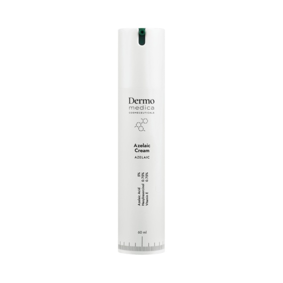 Krem zawierający 5% kwasu azelainowego, 0,75% witaminy E oraz 0,75% heksylorezorcynolu, skutecznie działający przeciwzaskórnikowo, przeciwtrądzikowo i rozjaśniająco. Kwas azelainowy, znany ze swoich silnych właściwości bakteriostatycznych i sebostatycznych, redukuje zmiany trądzikowe w przypadku trądziku pospolitego oraz różowatego. Jego łagodne działanie keratolityczne przyczynia się do wygładzania skóry oraz rozjaśniania przebarwień, poprawiając jednolity koloryt skóry. Heksylorezorcynol, jako inhibitor tyrozynazy, reguluje proces melanogenezy, zmniejszając przebarwienia posłoneczne, pozapalne oraz hormonalne. Kosmeceutyk doskonale sprawdzi się w pielęgnacji skóry mieszanej, łojotokowej, wrażliwej, naczynkowej oraz skłonnej do powstawania krostek i zaskórników.