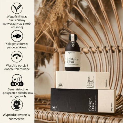 PROCEANIS Collagen Drink to zaawansowany suplement diety w płynnej formie, opracowany z myślą o wszechstronnym wsparciu skóry dojrzałej, zmęczonej i narażonej na stres oksydacyjny. Zawiera bioaktywny kolagen morski o wysokiej przyswajalności, wzbogacony o kompleks składników wspomagających syntezę kolagenu, nawilżenie i ochronę komórek skóry. Produkt działa synergicznie, poprawiając jędrność, elastyczność i gładkość skóry, przyczyniając się do redukcji zmarszczek i poprawy ogólnego wyglądu cery. Dzięki starannie dobranej formule działa nie tylko od wewnątrz, ale i z widocznym efektem na zewnątrz.